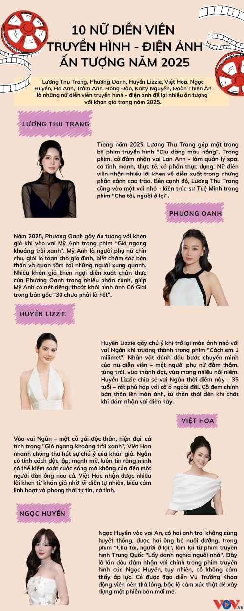 Lương Thu Trang, Phương Oanh, Huyền Lizzie, Việt Hoa, Ngọc Huyền, Hạ Anh, Trâm Anh, Hồng Đào, Kaity Nguyễn, Đoàn Thiên Ân là những nữ diễn viên truyền hình - điện ảnh để lại nhiều ấn tượng với khán giả trong năm 2025.