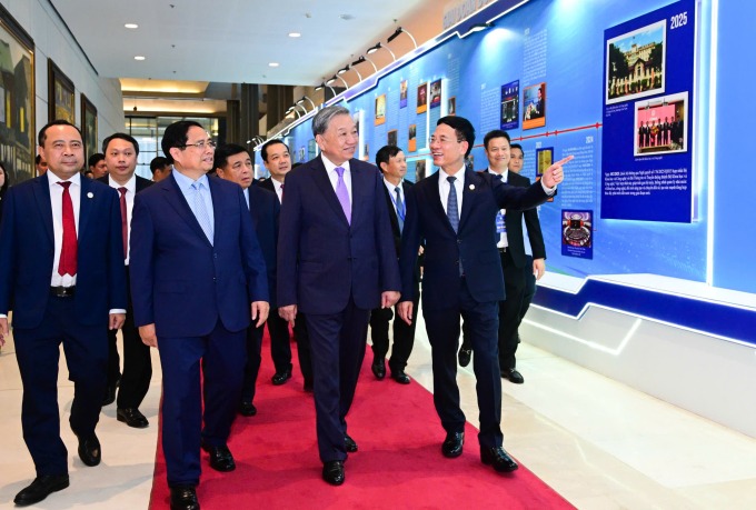 Tổng Bí thư Tô Lâm, Thủ tướng Phạm Minh Chính, Bộ trưởng Bộ Khoa học và Công nghệ Nguyễn Mạnh Hùng và Thứ trưởng Thường trực Vũ Hải Quân tại lễ kỷ niệm 66 năm ngành Khoa học và Công nghệ. Ảnh: Giang Huy |