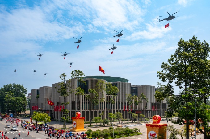 Trực thăng bay qua quảng trường Ba Đình trong buổi tổng duyệt diễu binh kỷ niệm Quốc khánh, ngày 30/8. Ảnh: Giang Huy |