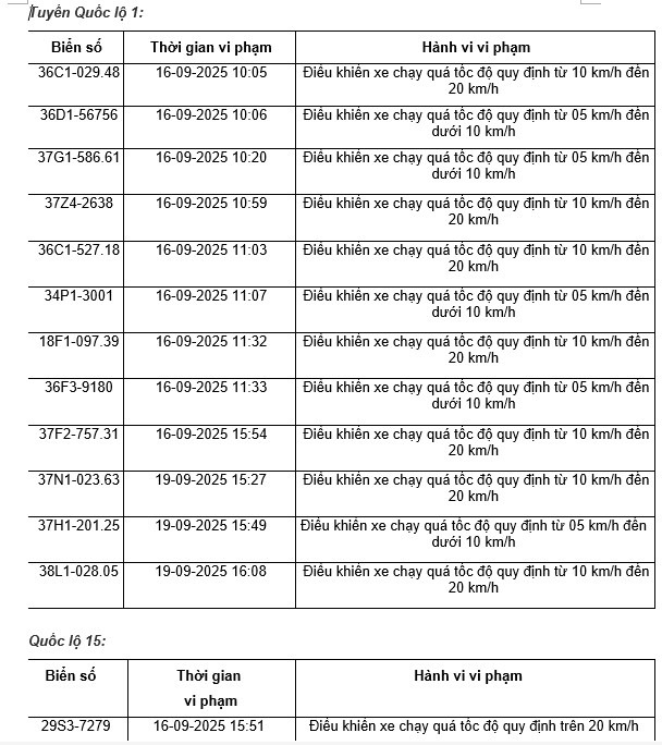 Công an tỉnh Thanh Hóa cũng vừa thông báo 13 trường hợp xe máy vi phạm tốc độ trên một số tuyến quốc lộ, ghi nhận trong thời gian từ ngày 16 đến 20/9/2025.