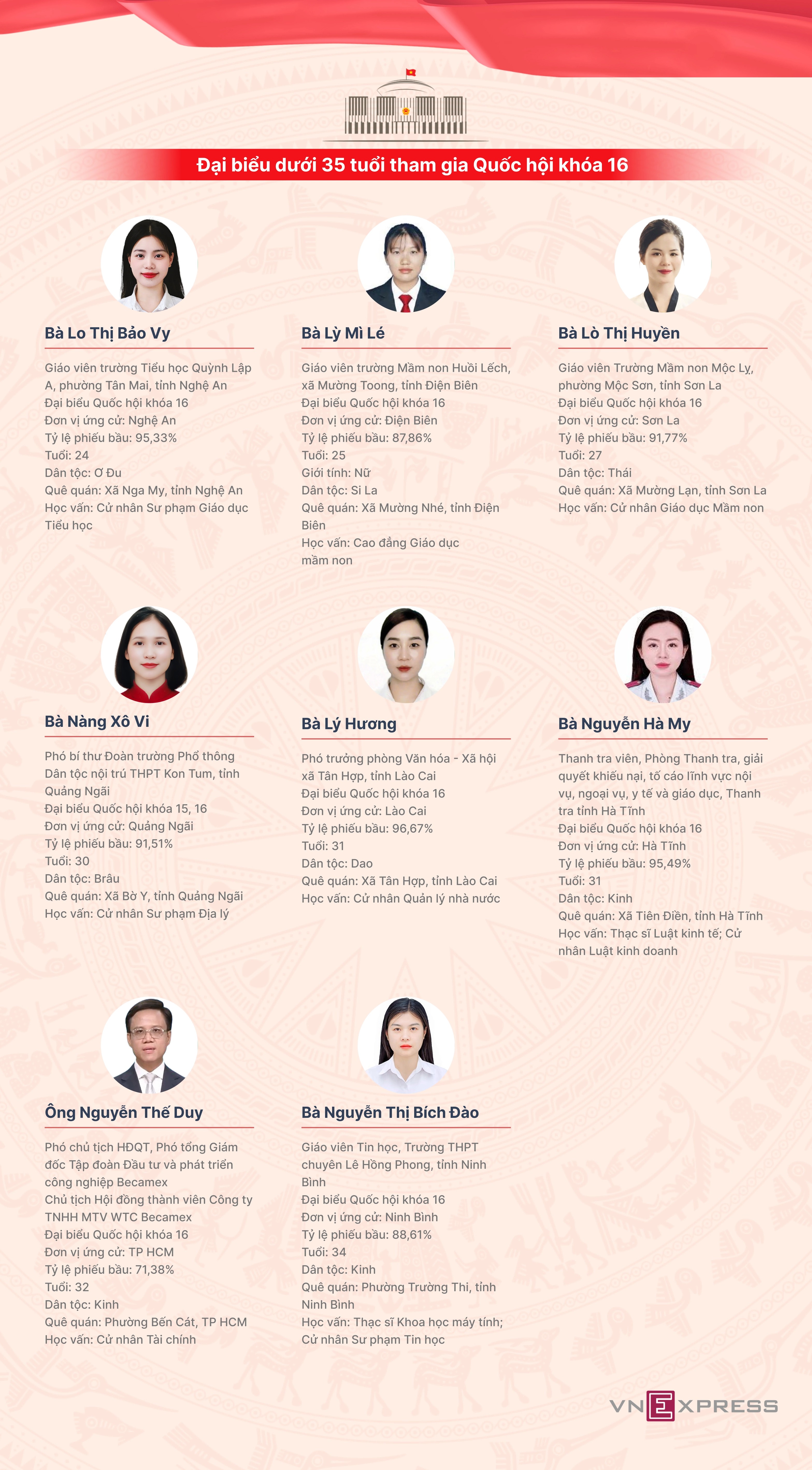 8 đại biểu dưới 35 tuổi trúng cử Quốc hội khóa 16 đến từ nhiều lĩnh vực như giáo dục, hành chính, doanh nghiệp; trong đó có giáo viên vùng cao, cán bộ cơ sở và đại diện các dân tộc thiểu số.