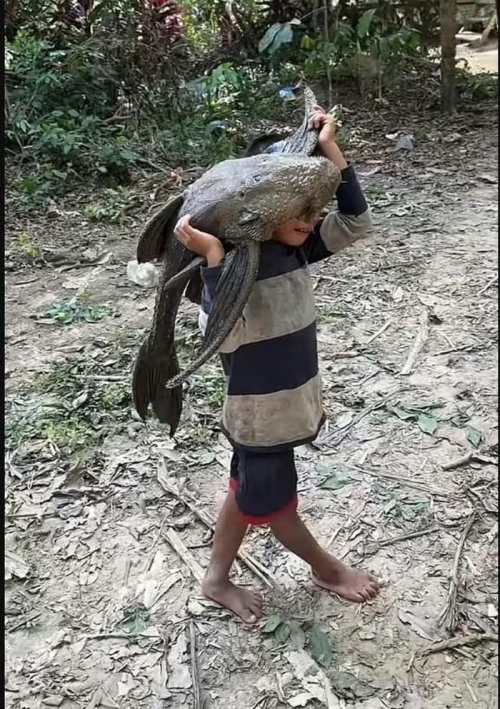 Có thể thấy, cậu bé đang vác một con cá trên vai, trong khi dân làng dừng lại xem với vẻ kinh ngạc. Một số người nhìn với sự tò mò, nhưng nhiều người lại bày tỏ sự sợ hãi vì vẻ ngoài kỳ lạ và đáng sợ của nó.