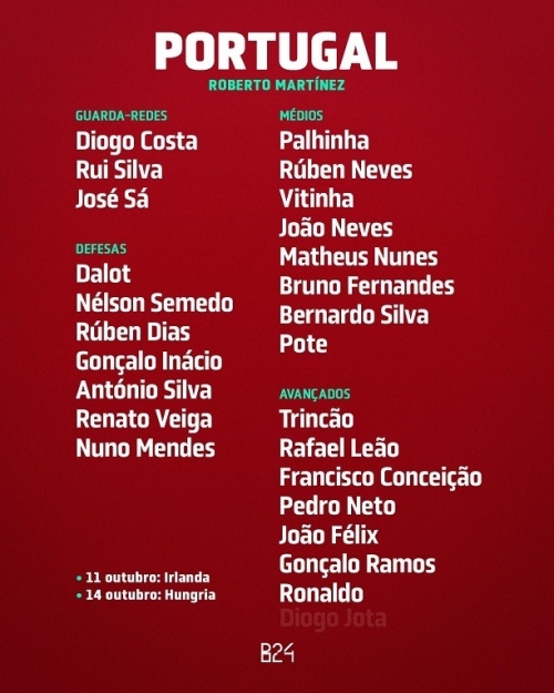 Trong tháng này, Bồ Đào Nha sẽ lần lượt đối đầu với Ireland (12/10) và Hungary (15/10). Sau 2 lượt trận mở màn, Selecao toàn thắng và dẫn đầu bảng H với 6 điểm tuyệt đối. Đối thủ đáng ngại nhất là Hungary của Szoboszlai lại khởi đầu chệch choạc, chỉ giành được 1 điểm sau 2 trận, mở ra cơ hội lớn cho Ronaldo và các đồng đội bứt tốc. Nếu giành trọn 6 điểm ở loạt trận này, Bồ Đào Nha nhiều khả năng sẽ sớm đoạt vé tham dự vòng chung kết.