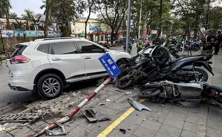 Chiếc xe ô tô con do người phụ nữ điều khiển bất ngờ tông liên hoàn nhiều xe máy trên phố Võ Thị Sáu, khiến một người bị thương nhẹ.