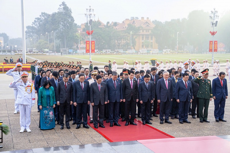 Sáng 19/1, trước giờ bắt đầu phiên trù bị Đại hội XIV của Đảng, Tổng Bí thư Tô Lâm và các đồng chí Ủy viên Bộ Chính trị: Chủ tịch nước Lương Cường, Thủ tướng Chính phủ Phạm Minh Chính, Chủ tịch Quốc hội Trần Thanh Mẫn, Thường trực Ban Bí thư Trần Cẩm Tú; Bí thư Trung ương Đảng, Chủ tịch Ủy ban Trung ương Mặt trận Tổ quốc Việt Nam Bùi Thị Minh Hoài cùng các đồng chí lãnh đạo Đảng, Nhà nước và đại biểu dự Đại hội đại biểu toàn quốc lần thứ XIV của Đảng đã đặt hoa, vào Lăng viếng Chủ tịch Hồ Chí Minh - Người sáng lập và rèn luyện Đảng ta, lãnh tụ vĩ đại của Đảng và dân tộc Việt Nam.