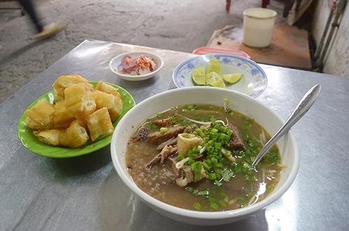 Cháo lòng ở khu chợ Đa Kao Tuy không phải là khu ăn vặt nổi tiếng, chợ Đa Kao thu hút thực khách tìm đến bởi có quán cháo lòng lâu năm. Nằm ở đầu một con hẻm đi vào chung cư, không gian quán đảm bảo cho thực khách thưởng thức món ăn mà không bị dính mưa. Mỗi tô cháo được phục vụ với giò, quẩy cùng một chén hành tím ngâm giòn, vị chua ngọt ăn kèm với thịt rất vừa miệng. Thực khách cũng có thể cho thêm chút nước mắm nguyên chất vào để chấm. Giá một tô là 40.000 đồng. Ảnh: Di Vỹ. |