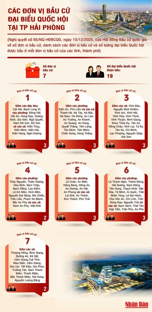 Thành phố Hải Phòng có 7 đơn vị bầu cử và số đại biểu Quốc hội được bầu là 19, theo Nghị quyết số 85/NQ-HĐBCQG, ngày 15/12/2025, của Hội đồng Bầu cử quốc gia, về số đơn vị bầu cử, danh sách các đơn vị bầu cử và số lượng đại biểu Quốc hội được bầu ở mỗi đơn vị bầu cử của các tỉnh, thành phố.