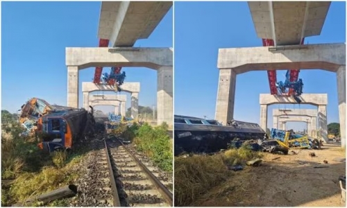Nguồn tin hiện trường cho biết một chiếc cần cẩu đang được sử dụng trong một dự án đường sắt cao tốc bất ngờ bị rơi xuống đường ray tàu hỏa rồi va vào đoàn tàu đang di chuyển, khiến đoàn tàu trật bánh và bốc cháy trong thời gian ngắn.