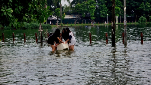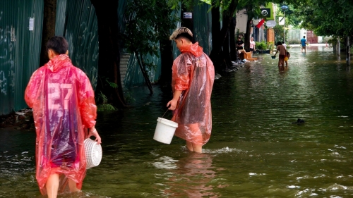 Trong bối cảnh giao thông khó khăn, không ít em nhỏ do được nghỉ học đã mang theo xô nhựa ra khu vực ngập để vui đùa, vầy nước. Một số nhóm bạn trẻ còn xách theo thùng xốp, rổ rá đi bắt cá tại những đoạn đường ngập sâu, tạo nên khung cảnh vừa lạ lẫm, vừa tiềm ẩn nguy hiểm.