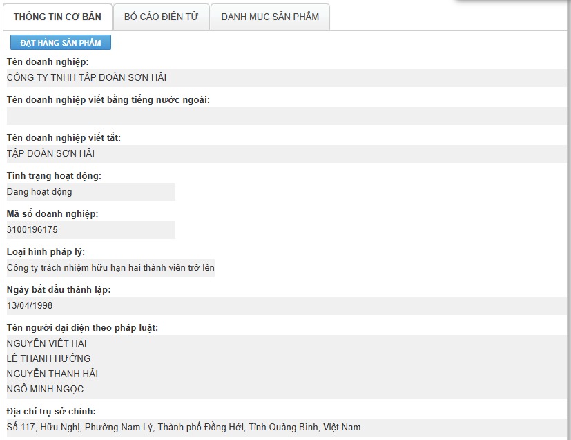 Thông tin về tập đoàn Sơn Hải ở Cổng thông tin Quốc gia về đăng ký doanh nghiệp |