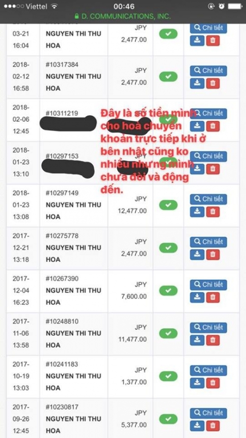 Hoàng thống kê những lần từ Nhật chuyển tiền yên cho Hòa. |
