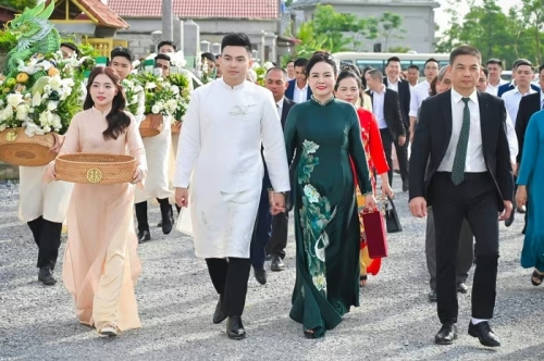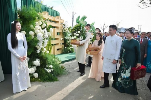 Khoảng 8h, chú rể Nguyễn Viết Vương cùng nhà trai mang theo 7 tráp ăn hỏi đến nhà gái trong niềm hân hoan, phấn khởi của người thân 2 bên gia đình. Bố chú rể là ông Nguyễn Viết Hải - Chủ tịch Hội đồng thành viên Tập đoàn Sơn Hải, đồng thời là người trực tiếp góp phần đưa doanh nghiệp từ một nhà thầu địa phương trở thành tập đoàn tư nhân quy mô hàng đầu khu vực miền Trung. |
