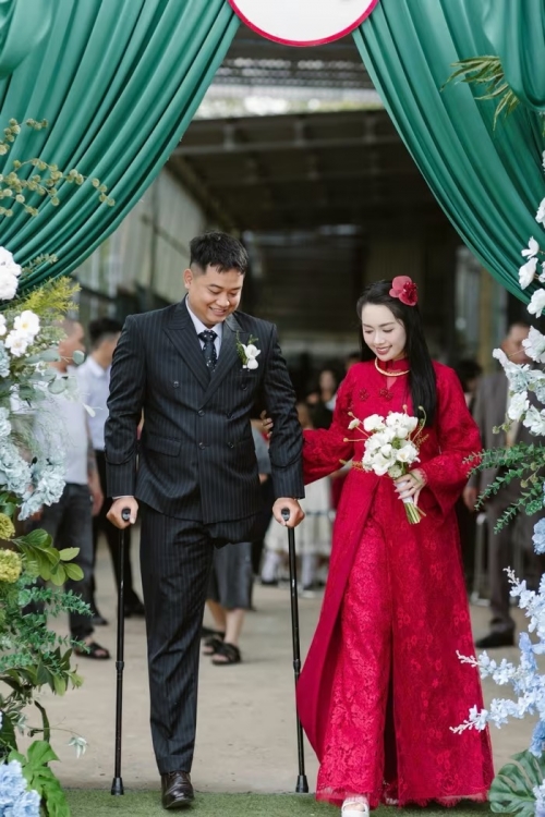 Ngày 1/11, đám cưới của Bùi Văn Tuyển (sinh năm 1997, hiện sống tại TP.HCM) và cô dâu Anh Thư (sinh năm 2001) diễn ra tại Lâm Đồng - quê nhà của cả hai. Điều khiến quan khách xúc động là hình ảnh chú rể 1 chân tự mình chống nạng vào đón cô dâu.
