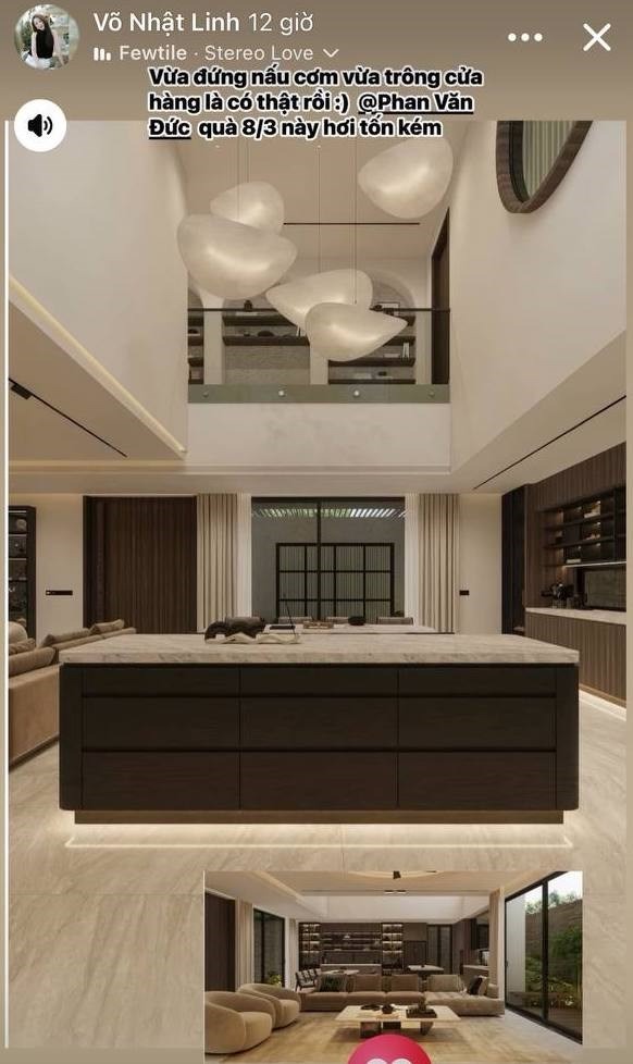 Trên trang cá nhân, nàng WAG đăng tải hình ảnh bản thiết kế 3D một căn biệt thự hoành tráng đang trong giai đoạn hoàn thiện cùng dòng trạng thái đầy tự hào: "Vừa đứng nấu cơm vừa trông cửa hàng là có thật rồi. Phan Văn Đức, quà 8.3 này hơi tốn kém".