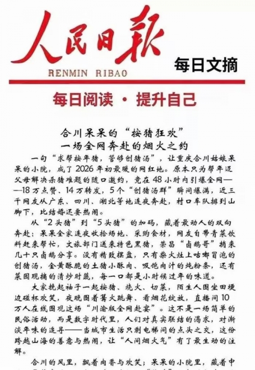 Đầu năm 2026, mạng xã hội Trung Quốc “nóng” lên bởi một cô gái 23 tuổi ở Hợp Xuyên – Trùng Khánh, có nick “Daidai” đăng video nhờ mọi người đến “bắt lợn”, biến bữa cỗ mổ lợn của nhà nông bình thường thành một lễ hội thu hút hàng vạn người đổ về, cả CCTV, Nhân dân Nhật báo... đều lên tiếng ca ngợi.