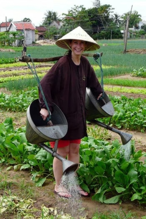 Khách Tây hóa thành nông dân, tưới rau ở làng Trà Quế. Ảnh: Visit Hoi An. |