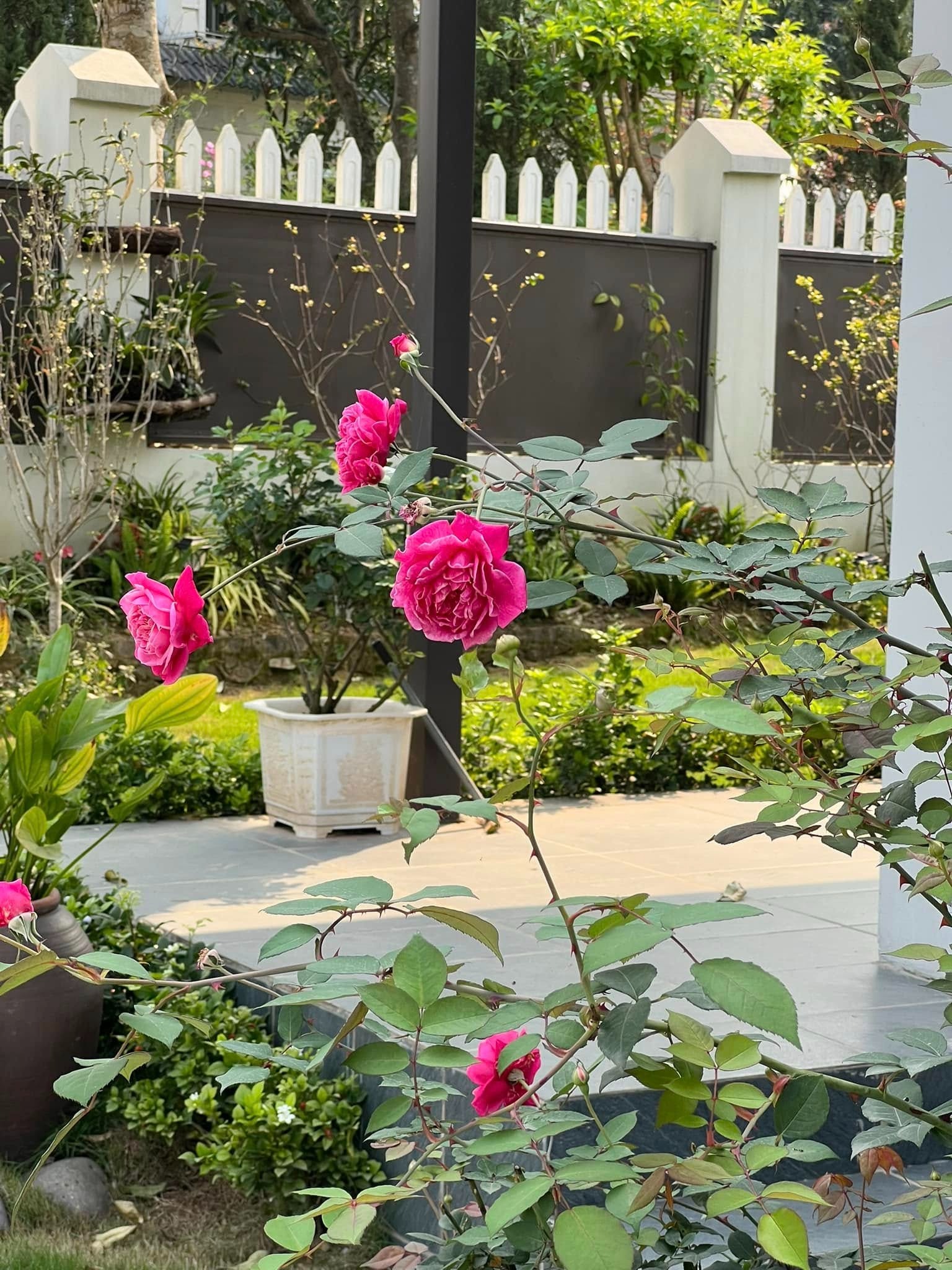 Khu vườn được chăm chút tỉ mỉ với nhiều loại cây và hoa. Đặc biệt, vườn của Diễm Quỳnh có rất nhiều hoa hồng. Những nhánh hồng leo vươn dài, trĩu nặng những nụ hoa hồng rực tạo nên một khung cảnh lãng mạn bao quanh lối đi.
