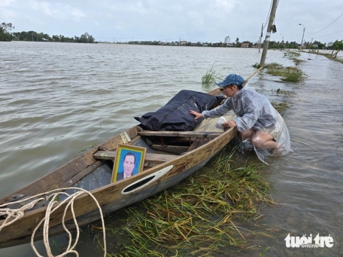 Con đường cuối thôn Thạch Tuân 1 dẫn ra cánh đồng làng vẫn chìm trong biển nước, chị Nguyễn Thị Út (49 tuổi) đang đứng lặng bên chiếc xuồng con. Trên đó là thi thể của ông Nguyễn Văn Thanh (90 tuổi), cha của chị Út được bọc trong vải bạt và một tấm di ảnh của ông Thanh.