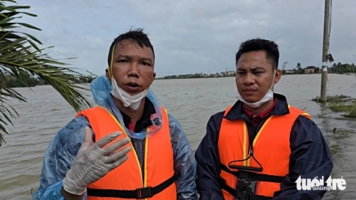Anh Nguyễn Đình Sướng (ngụ TP Đà Nẵng, bên trái) và anh Cao Đức Duy (ngụ TP.HCM) kể lại giây phút nhói lòng khi hỗ trợ đưa thi thể hai cụ ra khỏi vùng ngập nước - Ảnh: MINH HÒA |