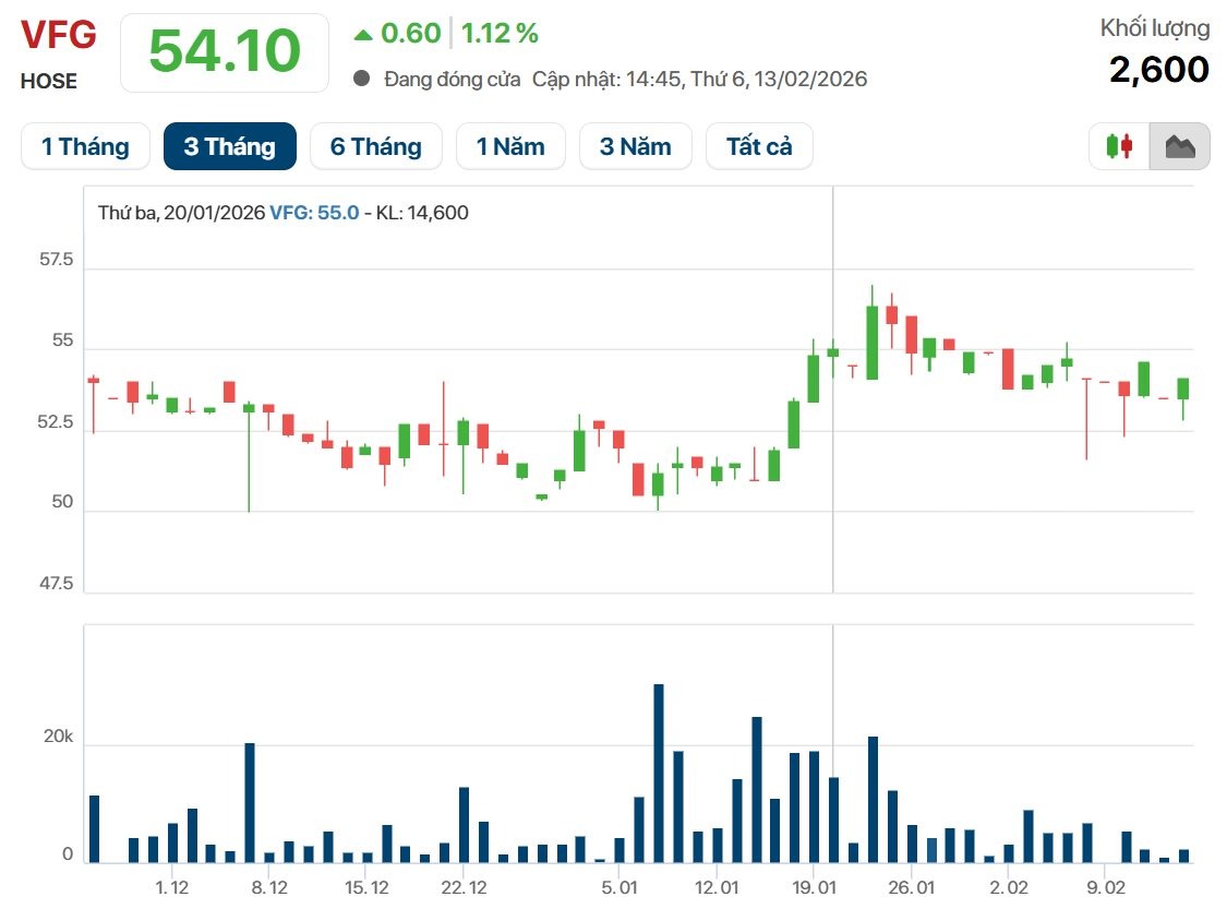 Trên thị trường chứng khoán, kết thúc phiên giao dịch ngày 13/2, cổ phiếu VFG có giá 54.100 đồng/cp, vốn hóa doanh nghiệp ở mức 2.257 tỷ đồng.