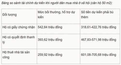 Theo tính toán của cơ quan chức năng, với một căn hộ diện nhà ở xã hội khoảng 50 m2, giá có thể lên tới 861 triệu đồng, thậm chí gần một tỷ đồng. Trong khi đó, mức bồi thường cho các hộ dân dao động 259 đến hơn 542 triệu đồng, tùy loại giấy tờ pháp lý. Phần chênh lệch người dân phải bù thêm có thể từ hơn 300 đến trên 700 triệu đồng.