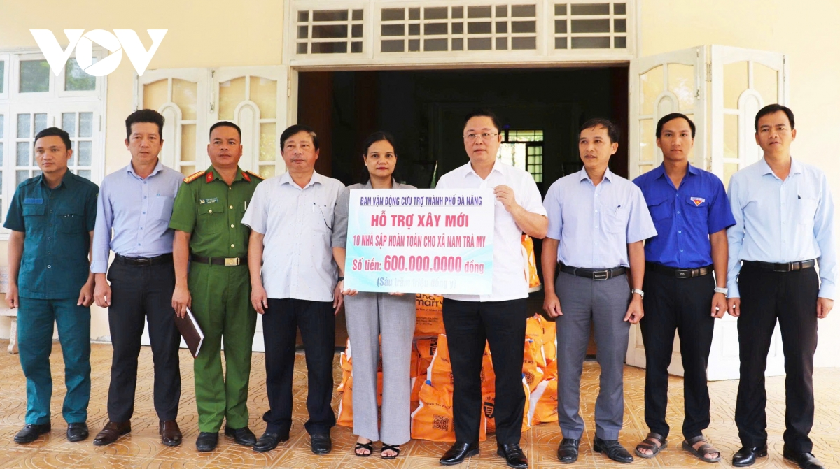 Ông Lê Trí Thanh, Chủ tịch Ủy ban Mặt Trận Tổ Quốc Việt Nam TP Đà Nẵng (thứ 4 từ phải qua) trao kinh phí hỗ trợ làm nhà tặng người dân xã Nam Trà My |