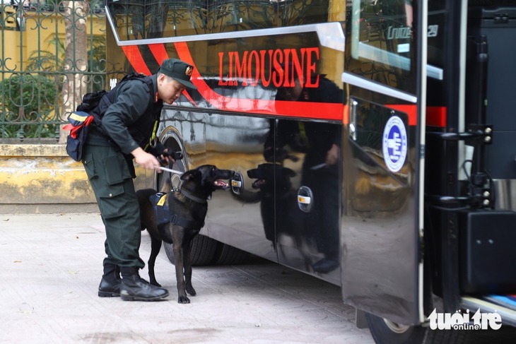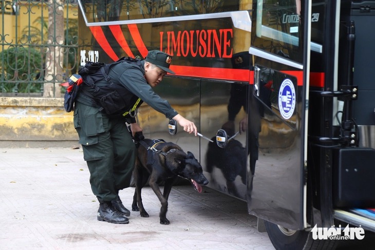 Chó nghiệp vụ còn được sử dụng để kiểm tra các khu vực, địa điểm diễn ra các sự kiện của đại hội - Ảnh: DANH TRỌNG |