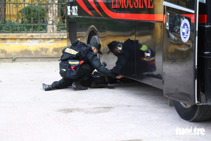 Trung úy Lã Ngọc Long sử dụng chó nghiệp vụ rà soát xe đưa đón đại biểu dự Đại hội Đảng - Ảnh: DANH TRỌNG |