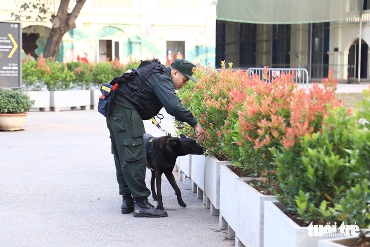 Cán bộ, chiến sĩ cùng chó nghiệp vụ tham gia bảo đảm an ninh, trật tự tại các hoạt động, sự kiện phục vụ Đại hội Đảng XIV - Ảnh: DANH TRỌNG |