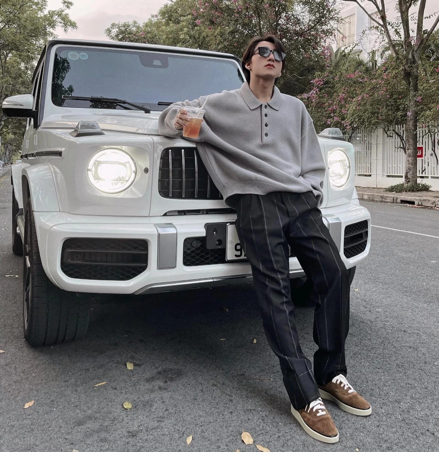 Tháng 5/2021, Sơn Tùng M-TP tiếp tục khiến mạng xã hội xôn xao khi đăng tải hình ảnh bên chiếc Mercedes-Benz AMG G 63 màu trắng, kèm dòng chú thích thông báo “gia nhập đội hình”. (Ảnh: FBNV) |