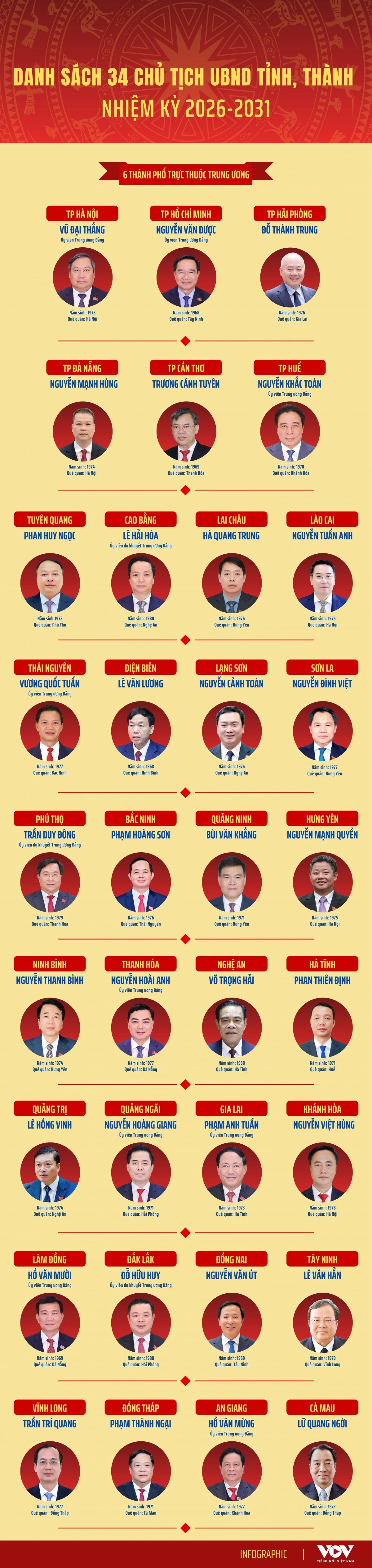 Hội đồng nhân dân (HĐND) 34 tỉnh, thành phố đã họp và bầu ra 34 Chủ tịch UBND tỉnh, thành phố nhiệm kỳ 2026-2031. Sau đây là danh sách cập nhật đến ngày 20/4/2026.