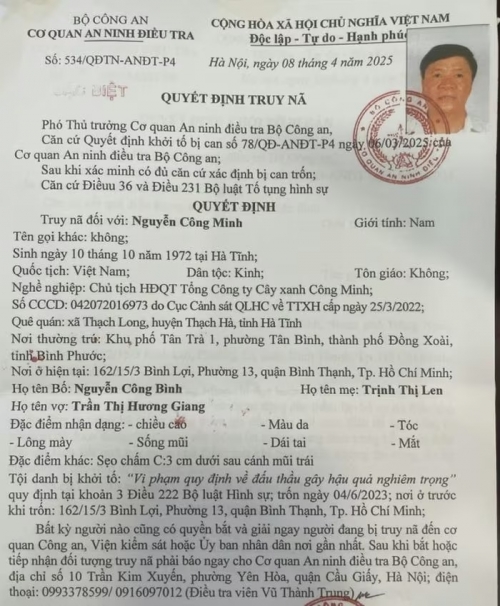 Bộ Công an ra Quyết định truy nã đặc biệt Chủ tịch Tổng Công ty Cây xanh Công Minh trước đó |