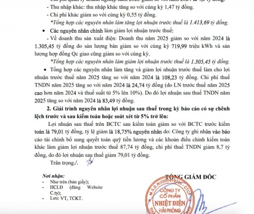 Giải trình của Nhiệt điện Hải Phòng về tình hình kinh doanh năm 2025. |