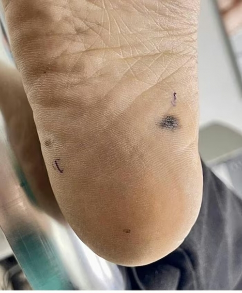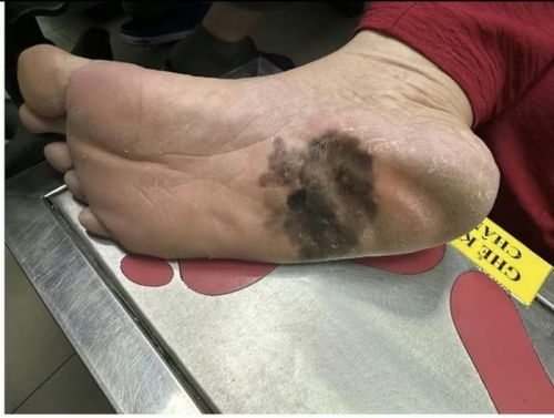 Hình ảnh tổn thương màu đen ở gan bàn chân của bệnh nhân được phát hiện ung thư da |