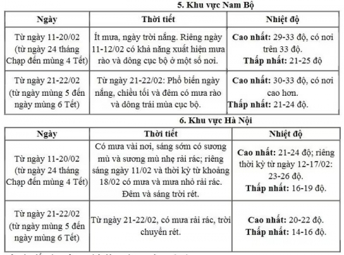 Trung tâm Dự báo Khí tượng thủy văn Quốc gia dự báo thời tiết từ 24 tháng Chạp đến mùng 6 Tết Nguyên đán Bính Ngọ. Trong đó, Hà Nội ghi nhận có mưa vài nơi, sáng sớm có sương mù và sương mù nhẹ rải rác.