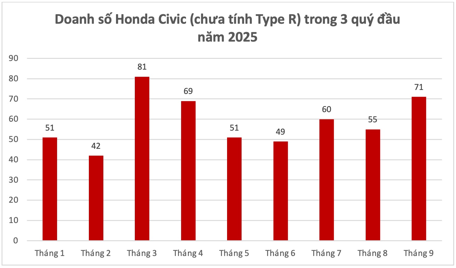 Trong 3 quý đầu năm 2025, Honda Civic không có biến động quá lớn về doanh số. Từ nửa sau của năm, mẫu xe này bắt đầu được khuyến mãi nhiều nên không bị sụt giảm dần đều doanh số như nhiều mẫu sedan khác.