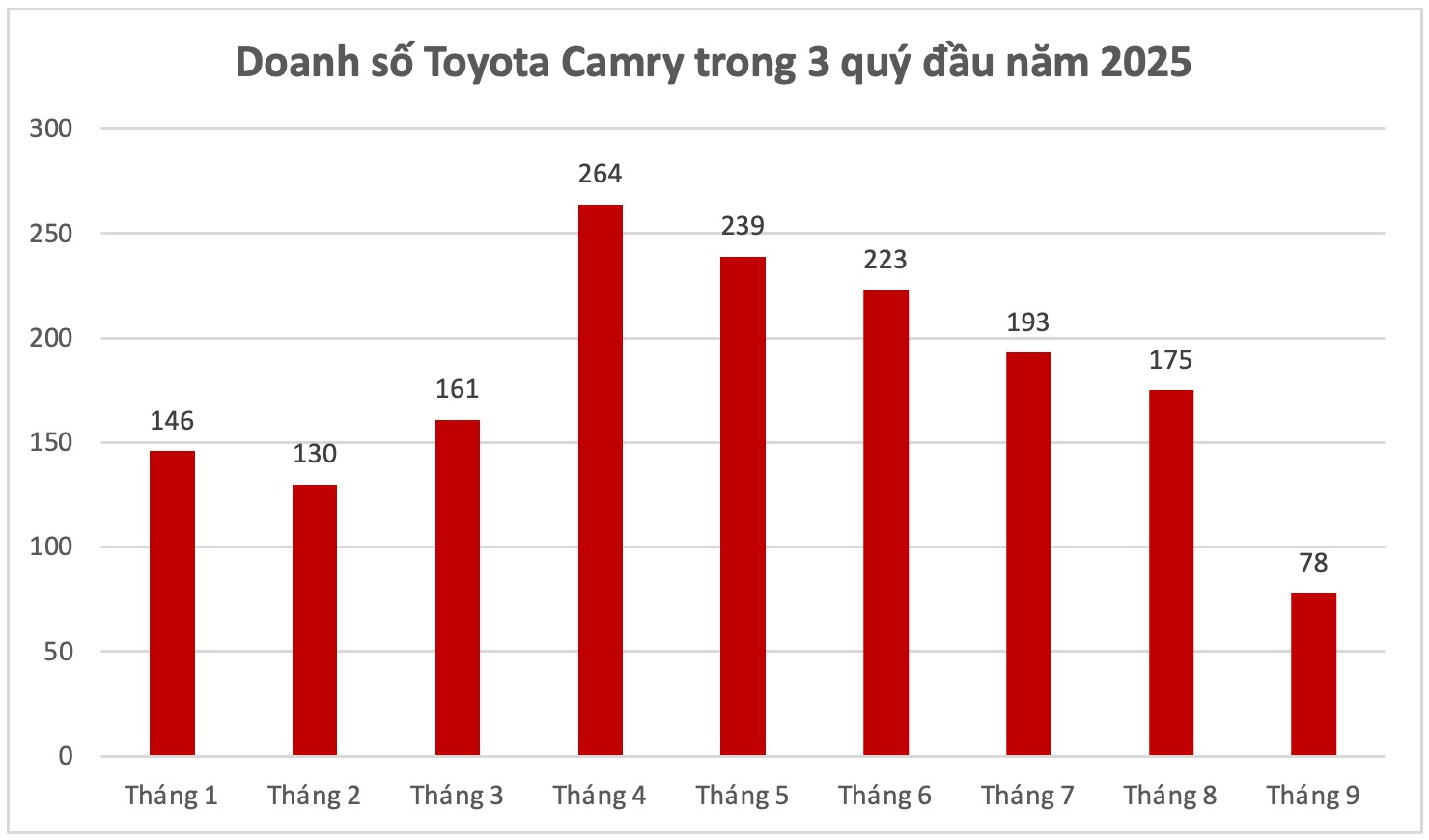 Từ đầu năm 2025 tới nay, doanh số Camry chỉ bùng nổ từ tháng 4, sau đó giảm dần cho đến hiện tại. Tuy nhiên, trong phân khúc, mẫu xe này vẫn bán chạy nhất. Đối thủ Mazda6 đã rút khỏi thị trường. Kia K5 và Honda Accord luôn nằm trong nhóm bán ít nhất thị trường.