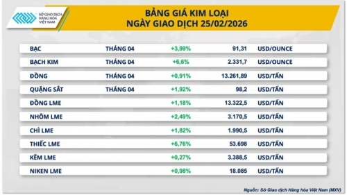 Trên thị trường thế giới, sắc xanh lan tỏa trên toàn bộ nhóm kim loại khi cả 10/10 mặt hàng đồng loạt tăng giá. Nổi bật, bạc COMEX nối dài chuỗi tăng sang phiên thứ 6 liên tiếp, với hợp đồng kỳ hạn tháng 4 bật tăng gần 4% lên 91,31 USD/ounce, đánh dấu lần đầu vượt mốc 90 USD/ounce kể từ sau nhịp điều chỉnh mạnh cuối tháng 1.