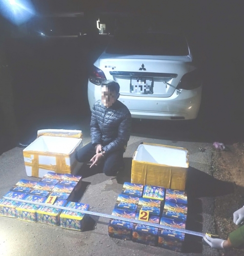 Tang vật thu giữ tại hiện trường gồm 18 hộp pháo hoa nổ, loại 49 ống do nước ngoài sản xuất. Số pháo hoa nổ này được bỏ trong các thùng xốp.