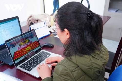 Cán bộ Dịch vụ sự nghiệp công phường Ái Quốc (TP Hải Phòng) biên tập bản tin về Đại hội Đảng toàn quốc lần thứ XIV để phát sóng, thông tin đến nhân dân địa phương. |