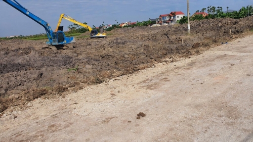 Đơn vị thi công đang phục vụ dự án tái định cư đường sắt tại xã An Khánh. Ảnh ND. |