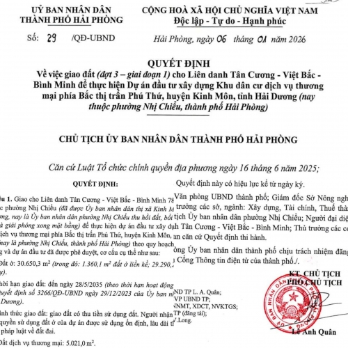 Quyết định số 29/QĐ-UBND do ông Lê Anh Quân, Phó Chủ tịch UBND TP Hải Phòng ký ngày 06/1/2026 về việc giao đất (đợt 3 – giai đoạn 1) cho Liên danh Tân Cương - Việt Bắc -Bình Minh để thực hiện Dự án đầu tư xây dựng Khu dân cư dịch vụ thương mại phía Bắc thị trấn Phú Thứ, huyện Kinh Môn, tỉnh Hải Dương (nay thuộc phường Nhị Chiểu, TP Hải Phòng).