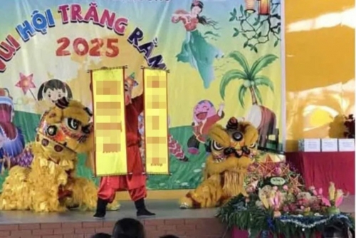 Nhà trường mời Đoàn múa lân nghệ thuật Hồng Ân đến biểu diễn, do Hiệu trưởng Hà Thị Mến trực tiếp liên hệ. Trong quá trình biểu diễn, đến phần cuối tiết mục múa lân, có hai dòng chữ “Chân Thiện Nhẫn Hảo” và “Pháp Luân Đại Pháp Hảo” được tung ra từ hai con lân trong khoảng 3-5 giây, sau đó được thu lại ngay.