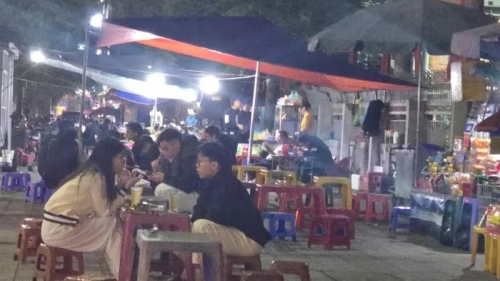Vìa hè rộng 5m đã trở thành nơi đậu đỗ xe, ăn đêm thường xuyên của người dân. Ảnh: Vĩnh Quân |