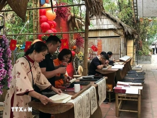 Nghệ nhân làng nghề khắc, in mộc bản Thanh Liễu tham gia nhiều sự kiện văn hóa để giới thiệu, quảng bá những giá trị về làng nghề tới công chúng. (Ảnh: Mạnh Minh/TTXVN) |