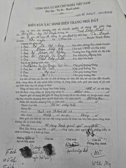 Tiếp đó, biên bản xác minh hiện trạng nhà đất được lập ngày 12/5/2004 tiếp tục căn cứ vào đơn xin nhượng nhà và chuyển quyền sử dụng đất giữa ông Hồ Sỹ Du – bà Nguyễn Thị Quyện có dấu hiệu giả mạo (bởi như đã nêu ở trên ông Du đã chết còn bà Quyện thì thực chất tên thật là Nguyễn Thị Tân). Người ký giáp ranh là bà Hồ Thị Tách là con của ông Du, bà Tân và là dì của anh Luật cho biết: “Năm 2004 khi đang ăn cỗ ở trong làng thì được anh Luật gọi về nói nhờ ký hộ giấy tờ, do đang bận và tin cháu mình nên bà đã ký mà không đọc nội dung, nếu biết nội dung ký là hộ giáp ranh thì bà đã không ký, bởi khi đó bà đang ở nhờ đất của gia đình”.