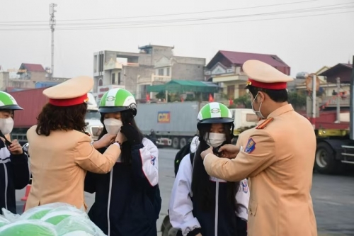 Trạm Cảnh sát giao thông An Hưng - Phòng Cảnh sát giao thông tặng mũ bảo hiểm đạt chuẩn cho học sinh. |