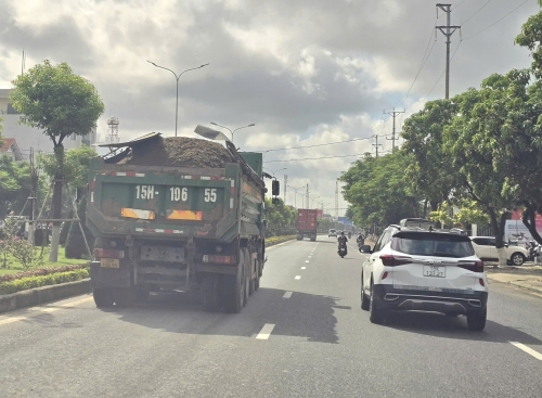 Phương tiện 15H-106.55 chở vật liệu quá thành thùng trên tuyến đường Phạm Văn Đồng (phường Hưng Đạo, TP. Hải Phòng) được camera ghi lại. |