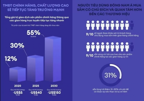 Theo nghiên cứu, tổng giá trị giao dịch sản phẩm chính hãng thông qua các gian hàng trực tuyến đã tăng nhanh từ 12% năm 2020 lên 30% năm 2025, tạo ra thị trường khoảng 40 tỷ USD. Dự báo đến năm 2030, con số này có thể đạt đến 55% thị trường thương mại điện tử Đông Nam Á, tương đương 150 tỷ USD.
