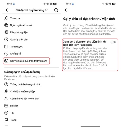 3, Trong trang này, người dùng sẽ thấy hai tùy chọn. Hãy đảm bảo cả hai nút gạt sau đều được tắt: "Xem gợi ý dựa trên thư viện ảnh khi bạn lướt xem Facebook" và "Nhận ý tưởng sáng tạo dành riêng cho bạn bằng cách cho phép xử lý đám mây thư viện ảnh" (nếu có).